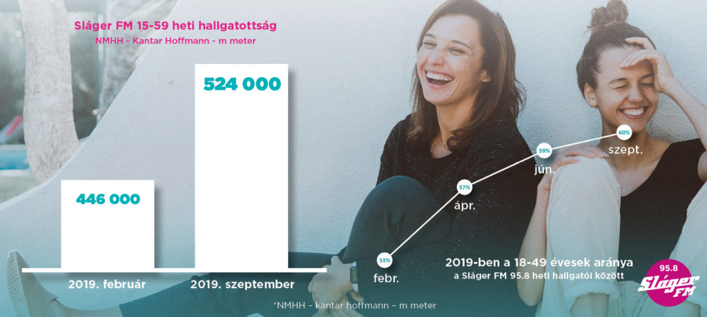 Ennek köszönhetően – NMHH – Kantar Hoffmann – m meter 2019. július-szeptemberi adatai alapján – a 95.8 Sláger FM hallgatóinak 76 %-a a 15-59 éves korosztályból került ki, ami azt jelenti, hogy ebben a korcsoportban, hetente közel 80.000-rel többen választották a 95.8 Sláger FM-et, mint ezt megelőzően. Sőt, a kereskedelmileg kiemelten fontos 18-49 évesek aránya is 60%-ra növekedett a rádió hallgatói között. A vizsgált időszakban hetente 413 000 fő hallgatta a 95.8 Sláger FM-et ebből a korcsoportból.