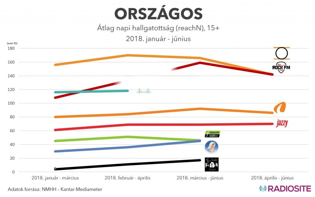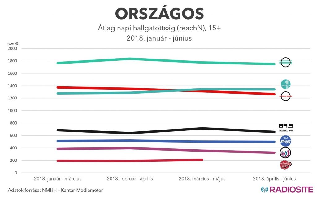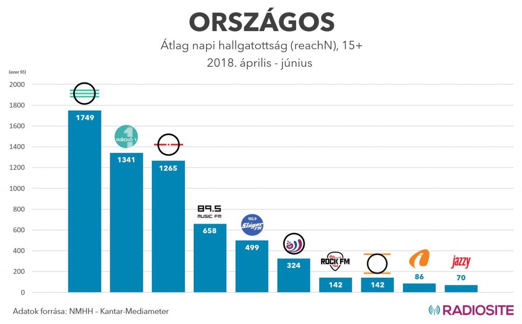 Továbbra is a Petőfi Rádió Magyarország legnagyobb elérésű rádióállomása – derül ki az egységes rádiós közönségmérés április és június között felvett adataiból. Az NMHH honlapján közzétett számok alapján a közszolgálati média popzenei rádiója 1,7 millió fős hallgatótáborral rendelkezik, őt követi a Rádió 1 és a Kossuth Rádió 1,3 milliós közönséggel. Negyedik a sorban a Music FM 658 ezer hallgatóval, majd a Sláger FM következik 499 ezer fővel. A Dankó Rádió 324 ezer hallgatóval hatodik a listán, a Rock FM valamint a Bartók Rádió egyaránt 142 ezres napi hallgatótáborral a hetedik, illetve a nyolcadik. A százezer főt el nem érő állomások közül az Inforádió napi hallgatottsága 86 ezer, a Jazzyé 70 ezer.