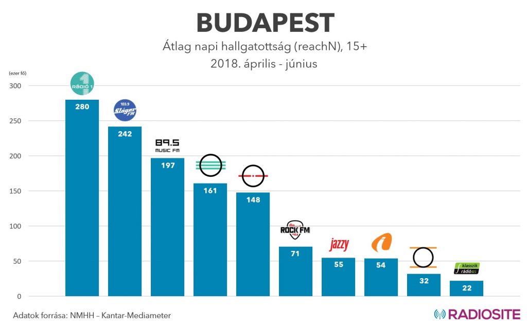 Budapesten az átlagos napi hallgatószám tekintetében első helyen áll a Rádió 1 (280 ezer hallgató naponta), második a Sláger FM (242 ezer), harmadik a Music FM, 197 ezer fős hallgatótáborával. A Petőfi Rádió 161 ezer, a Kossuth Rádió 148 ezer embert ér el napi szinten a fővárosban. Követi őket 100 ezernél kevesebb hallgatóval a Rock FM 95.8 (71 ezer fő), a Jazzy Rádió (55 ezer fő), és az Inforádió (54 ezer hallgató). Nem éri el az ötvenezer napi hallgatót a Bartók Rádió (32 ezer fő), illetve a Klasszik Rádió (22 ezer fő).